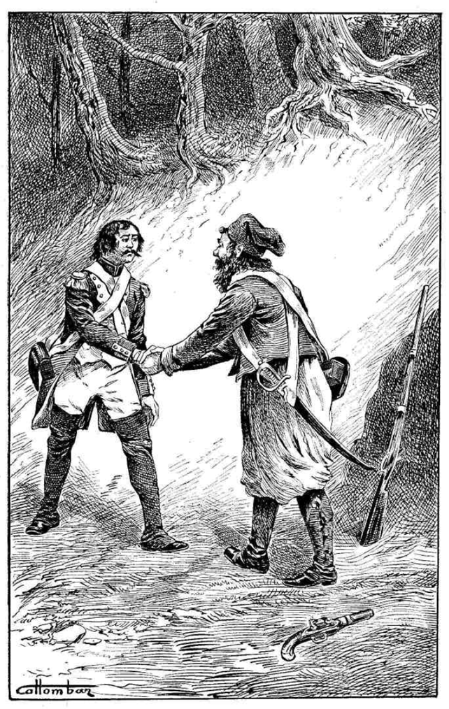 Enfin il arriva, à la suite de son guide, dans une petite clairière, traversée par un filet d’eau, et presque entièrement entourée d’arbres de haute futaie, si serrés les uns contre les autres, qu’on eût dit un rempart, formé tout exprès pour défendre cette place, au milieu de laquelle s’élevaient deux ou trois cabanes de branches entrelacées. Elles paraissaient désertes et nulle créature humaine ne se montrait dans les environs ; mais lorsque le jeune paysan eut fait entendre un sifflement aigu, pareil à celui d’un oiseau nocturne, un personnage singulier surgit de dessous terre et parut tout armé, à vingt pas de distance, sans que le sergent Vernon pût deviner de quel lieu il sortait. C’était un homme trapu dont les membres nerveux et les épaules démesurément larges annonçaient une force prodigieuse.